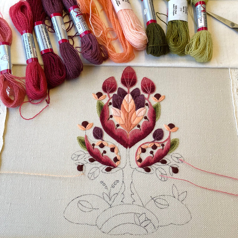 Traditional and Modern Crewel Work Embroidery kits from Melbury Hill. Our Crewel Work Embroidery Kit range, designed by Sarah Stevens are wonderful for all tastes and levels. We source the best of British suppliers for all our Kits which contain full instructions a colour picture of the design, printed Linen Twill with the design outline and stitch guidance, whole skeins of Appleton wools and two Chenille needles. We also have a lovely range of Embroidery tools, hoops and frames from Elbesee to assist in your Embroidery projects. Follow our social media sites for the latest new, fun stitch ideas and the creative processes and be the first to see offers and new kit releases by signing up to our email Newsletter.